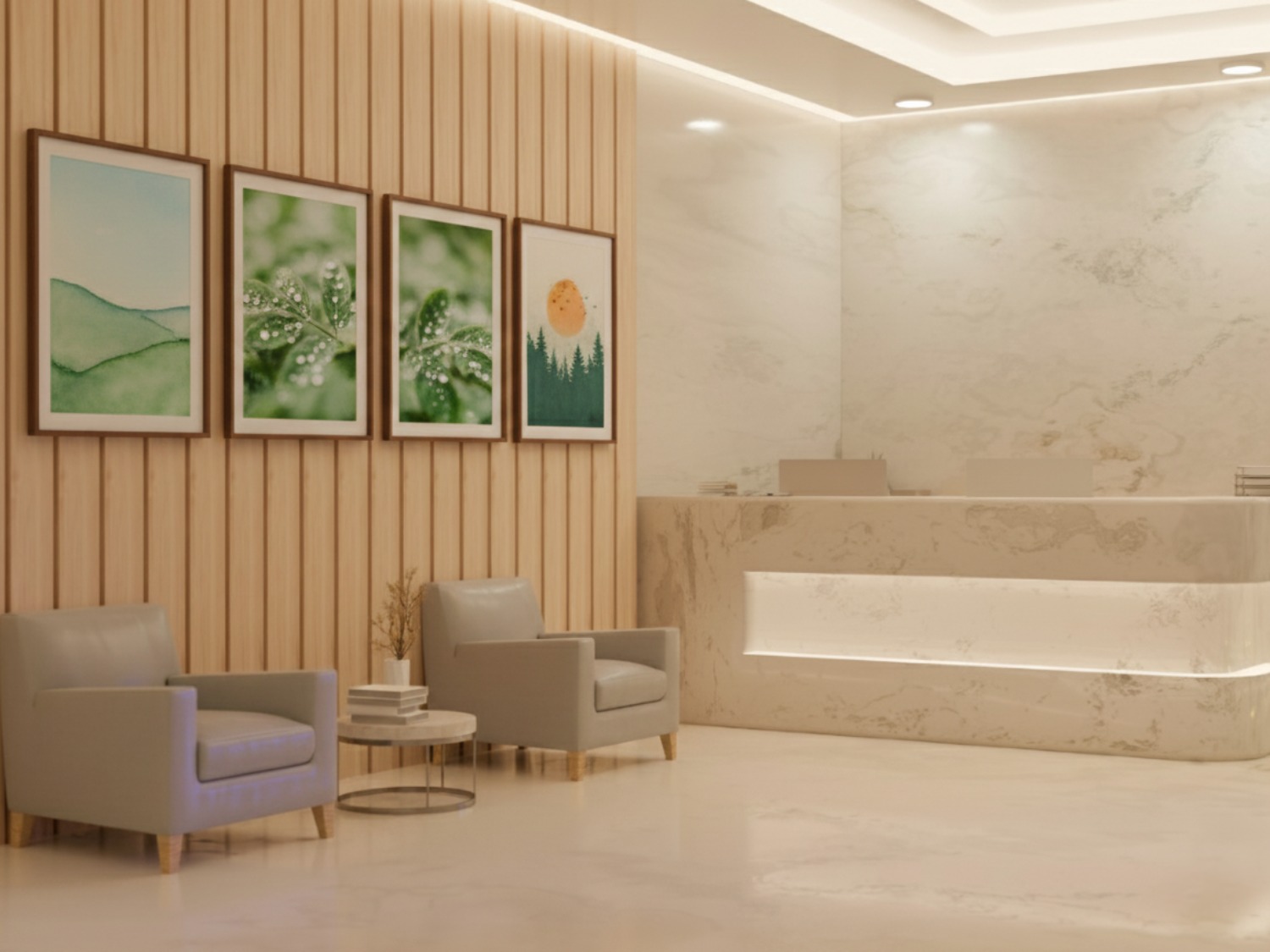 医療空間に適した衛生面に配慮しながら、掃除がしやすいインテリアで空間に温かみを演出します。待ち時間対策としては、未使用時は鏡になるラグジュアリーなモニターや、白い壁にプロジェクターで音のない環境映像を投影することで、殺風景な院内に色味と動きが加わり、患者の退屈さの改善に繋がります。さらに虫が湧かず、手入れ不要なアートフラワー(造花)などを受付に置くと、来院直後の緊張感がほぐれます。