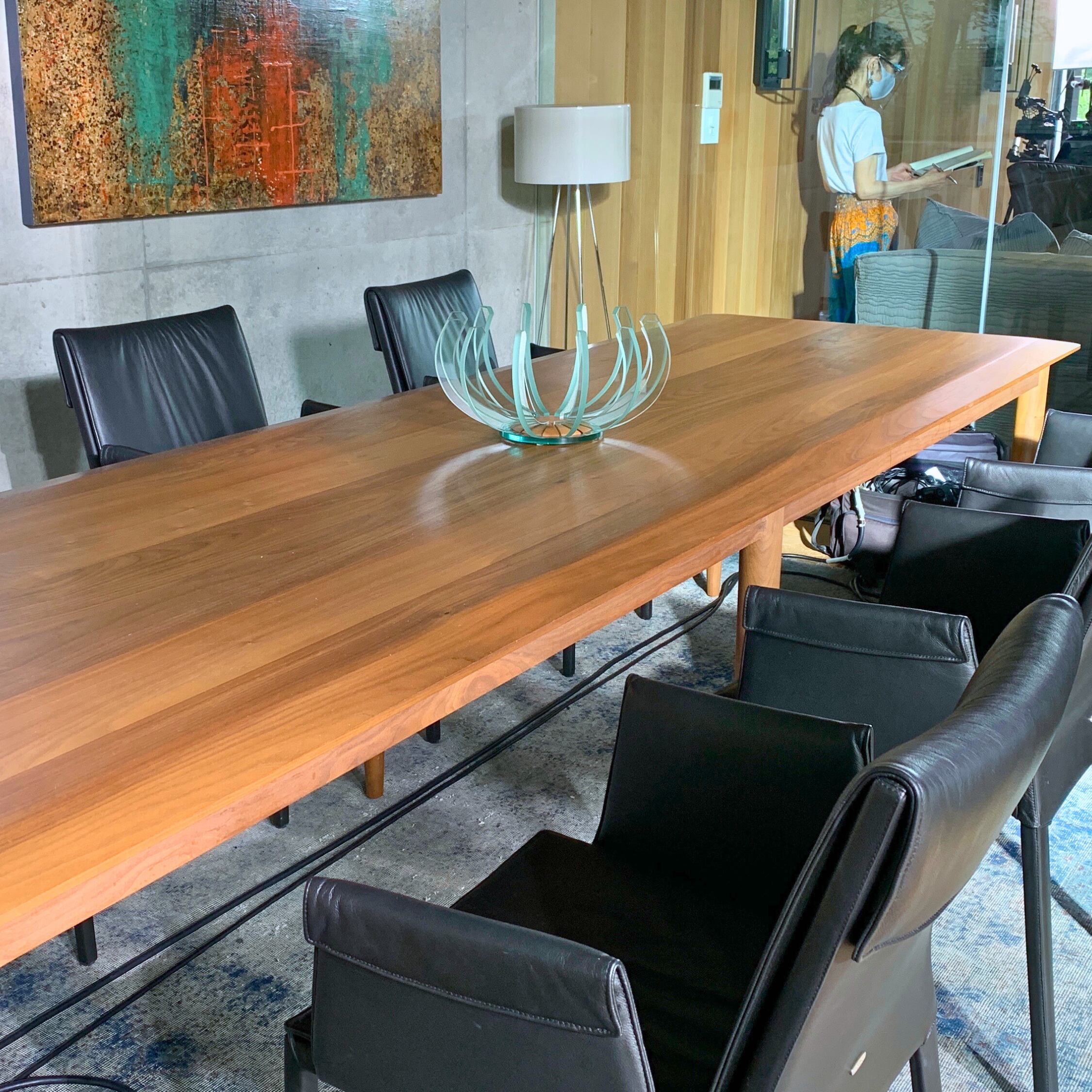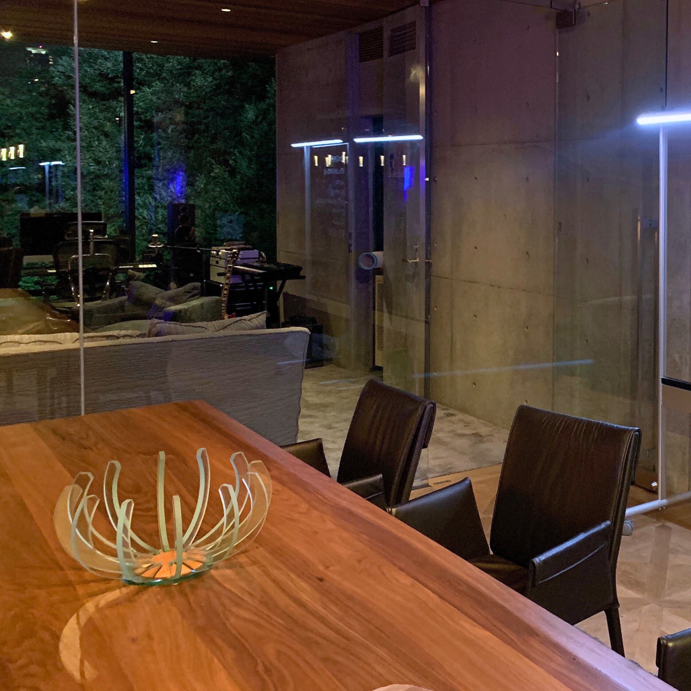 放射状に配した12本の湾曲ガラスが光を受けて陰影を生むセンターピース。