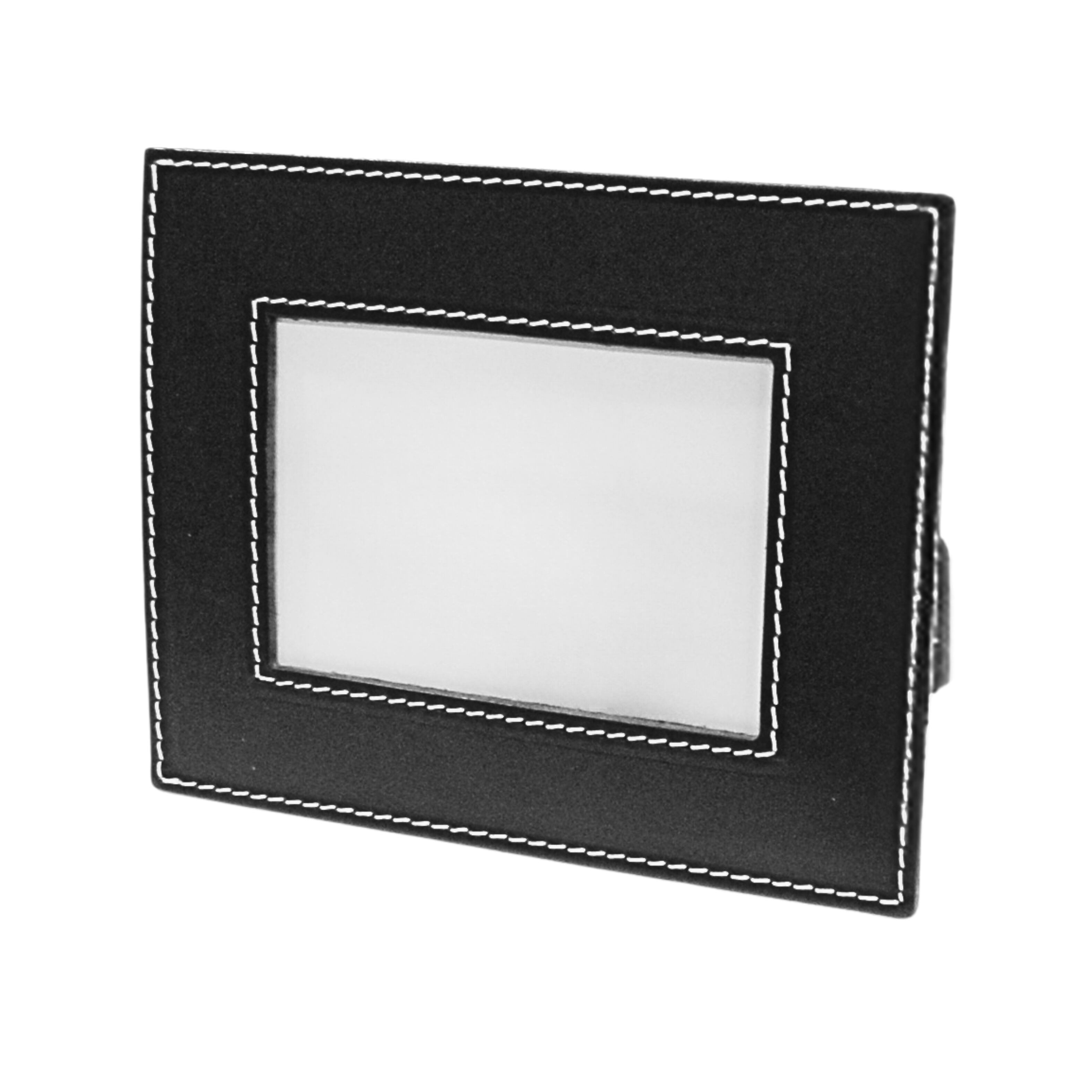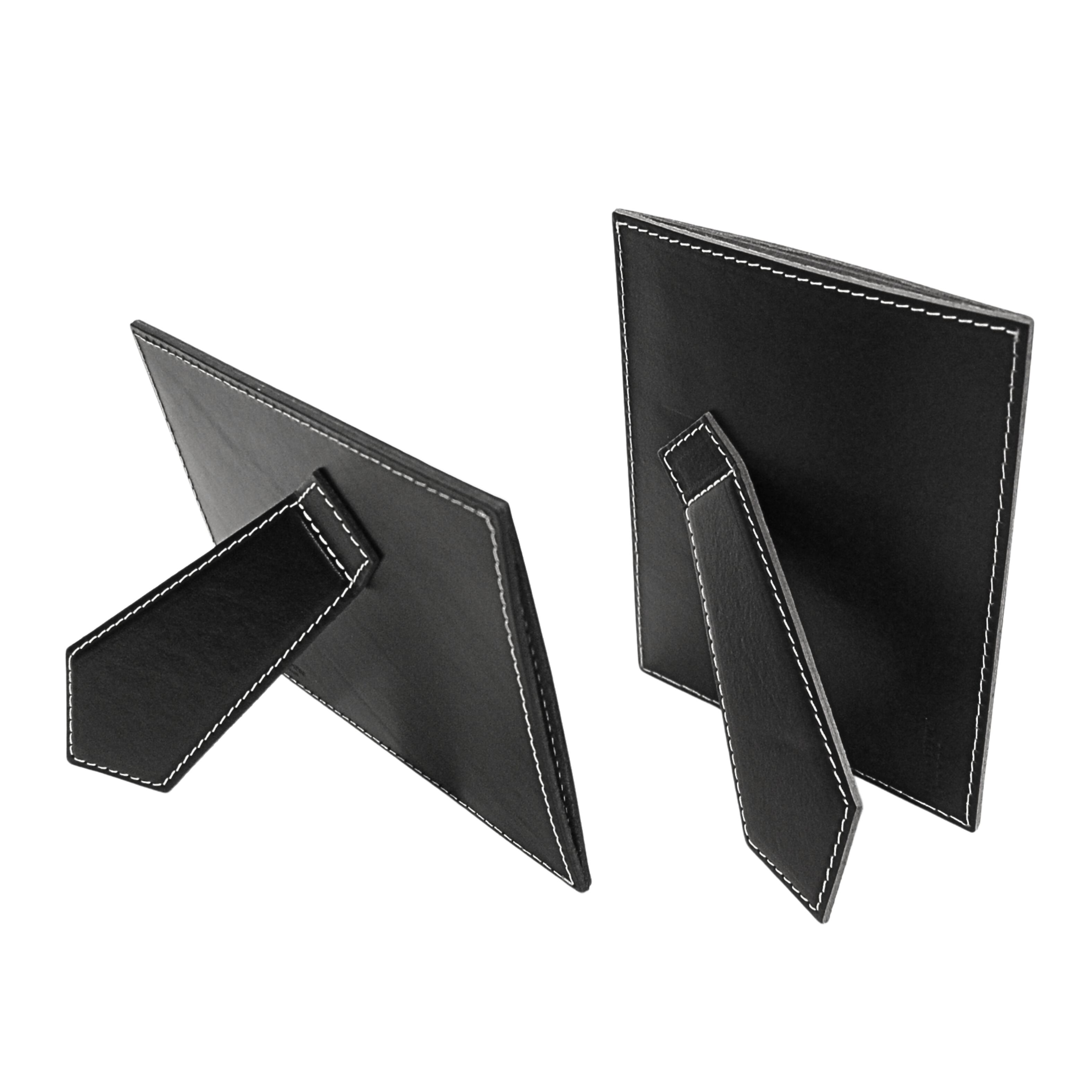 革小物のような重厚感と、白いステッチが映えるブラックレザーのフォトフレーム。イタリア・トスカーナ産のタンニンなめし革を贅沢に使用。2L版写真に最適なサイズで、書斎や受付カウンターにもおすすめです。縦使用、横使用可能です。スタンドは折りたためるため、持ち運びにも便利です。