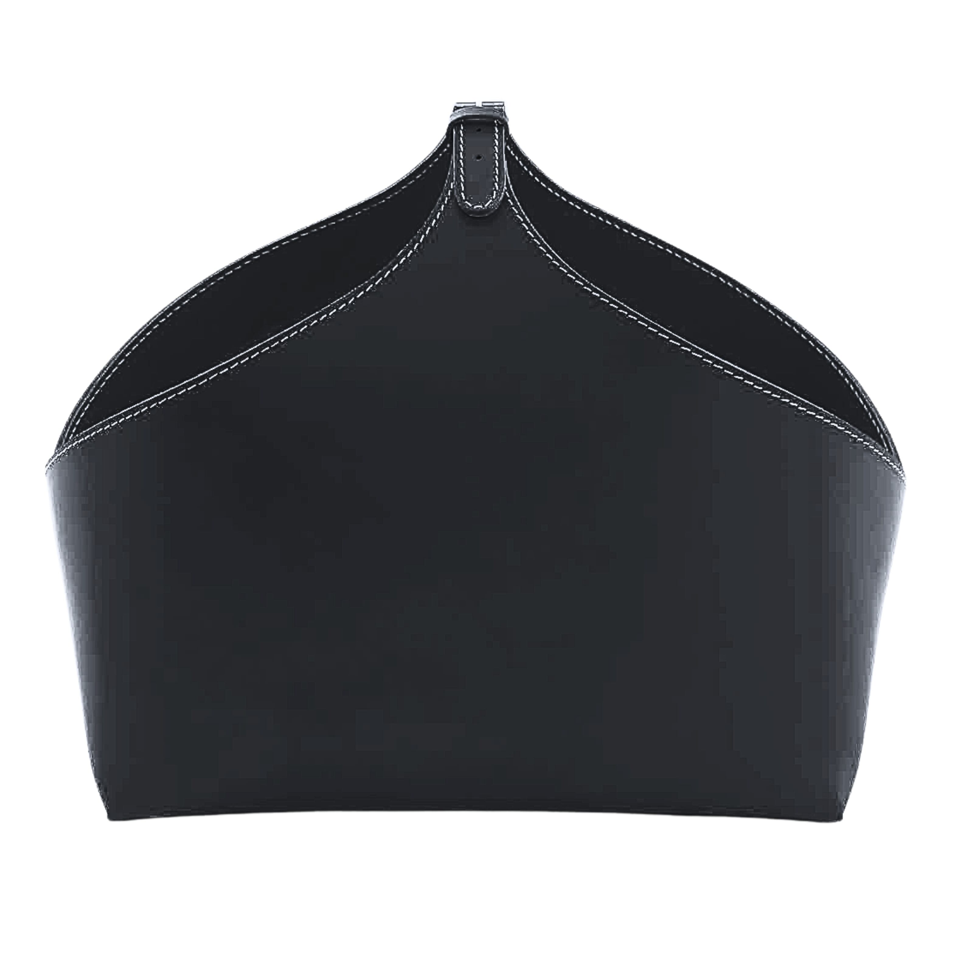 黒のレザーバスケットが空間に重厚感を与えるマガジンラック。優美な曲線と白いスティッチが特徴で、書斎や応接空間に最適。持ち運びやすいハンドル付きで、実用性と美しさを兼ね備えた一台です。