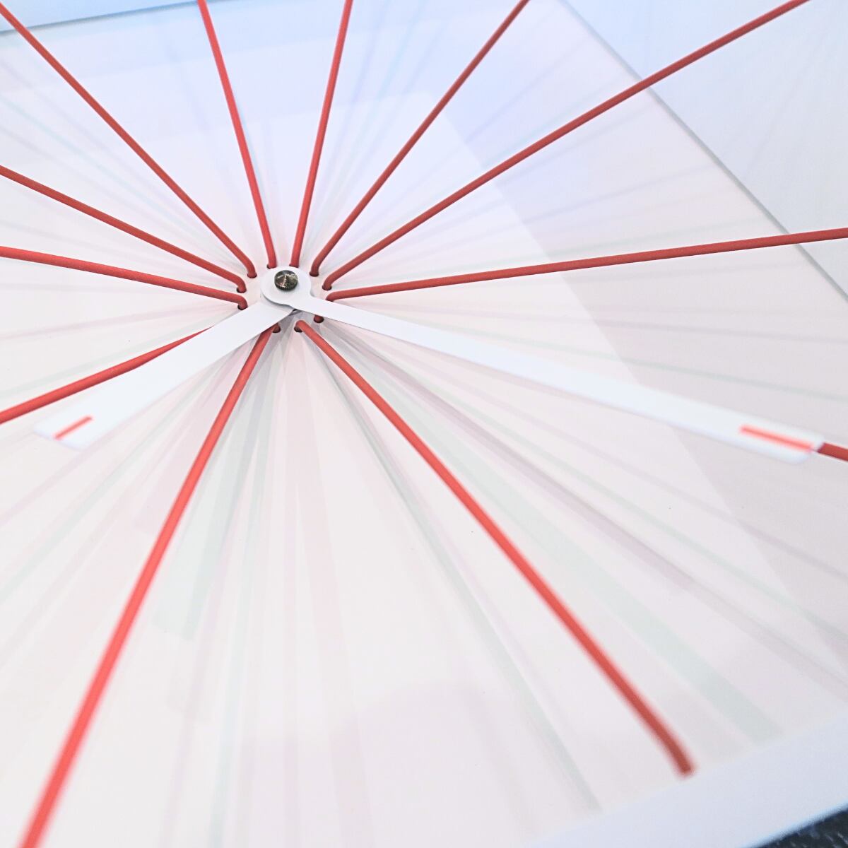 奥行を感じさせる透視図のような構造が印象的な掛け時計。ホワイトを基調に赤を効かせた建築的デザインは、空間に緊張感とリズムをもたらします。現代的なオフィスやサロン、ギャラリーに映える存在感あるインテリアピース。