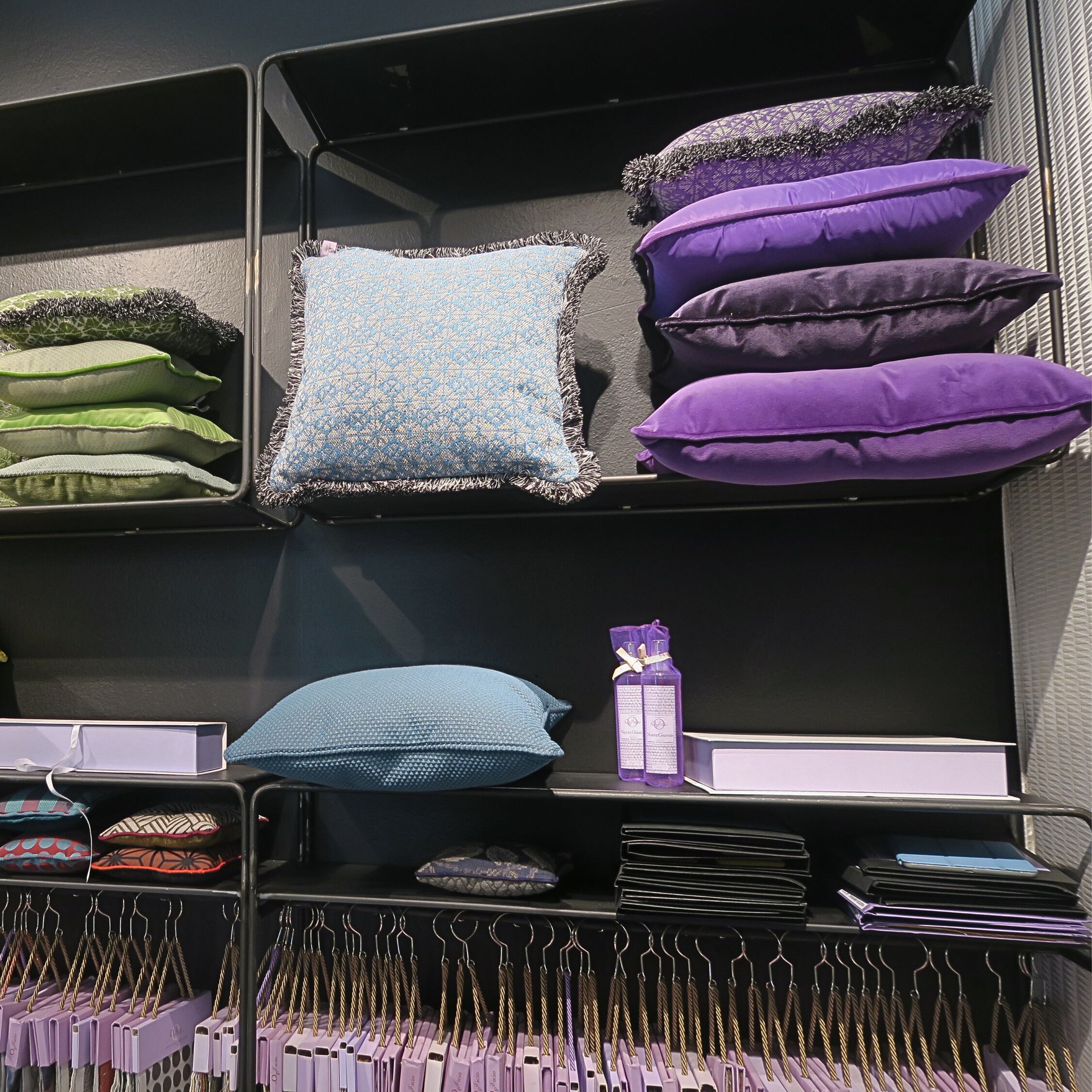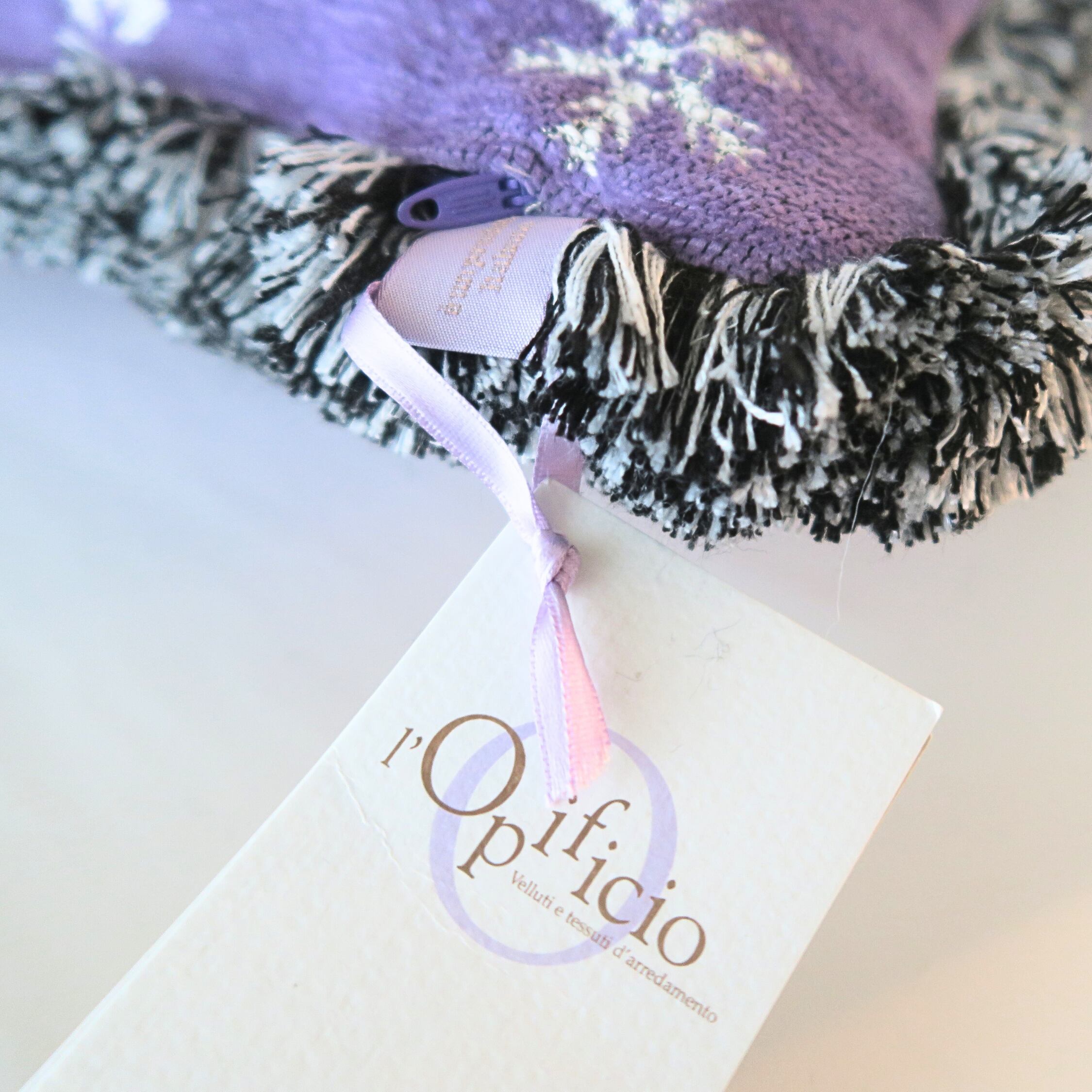 トリノの幻想的な雪景色を表現した、起毛素材のアートテキスタイル。パープル地に白い結晶模様が浮かび上がる、上質であたたかみのある風合い。ブラック×ホワイトのフリンジが、ラグジュアリーな空間に個性を添える。