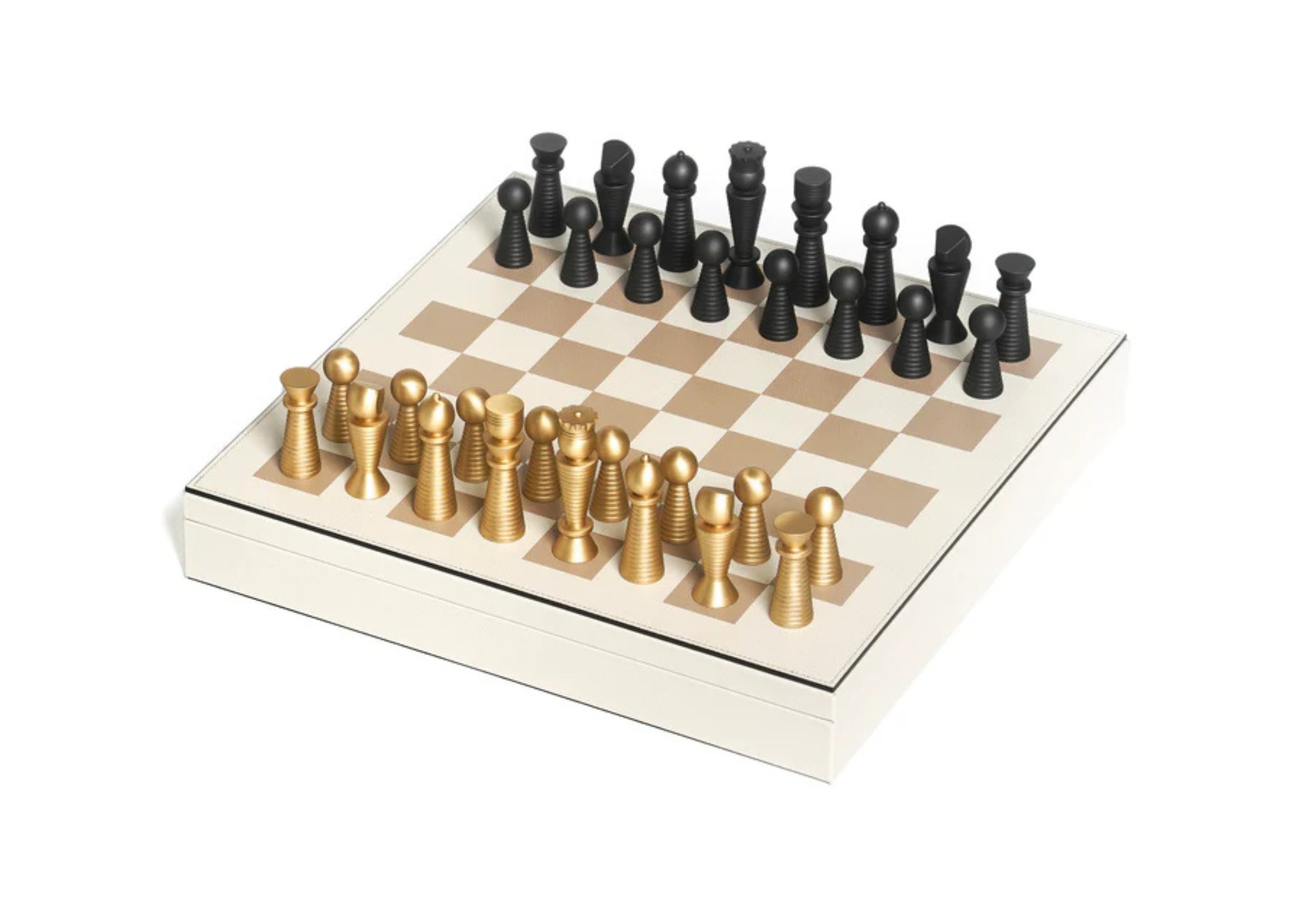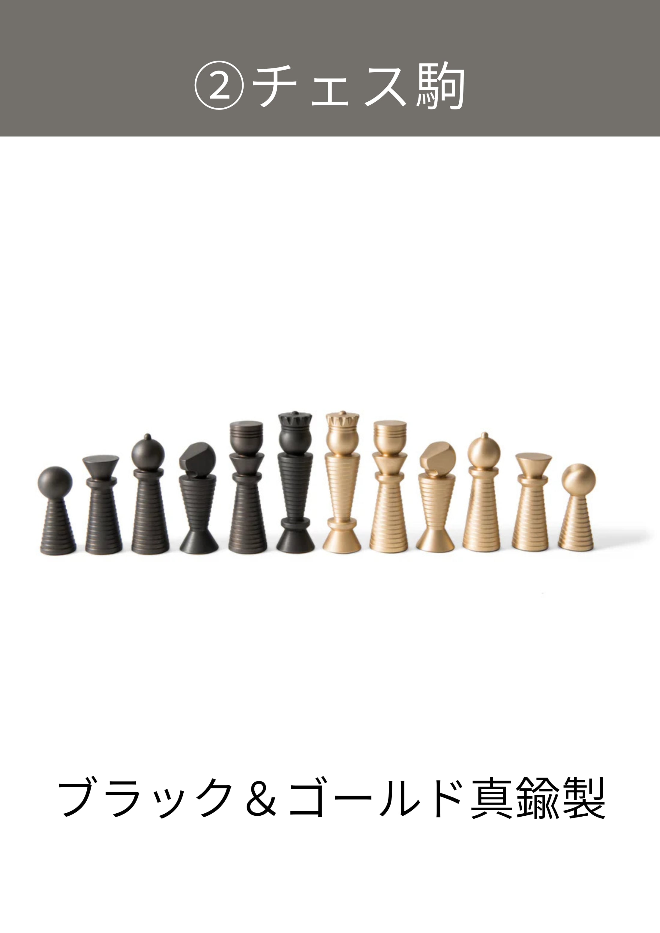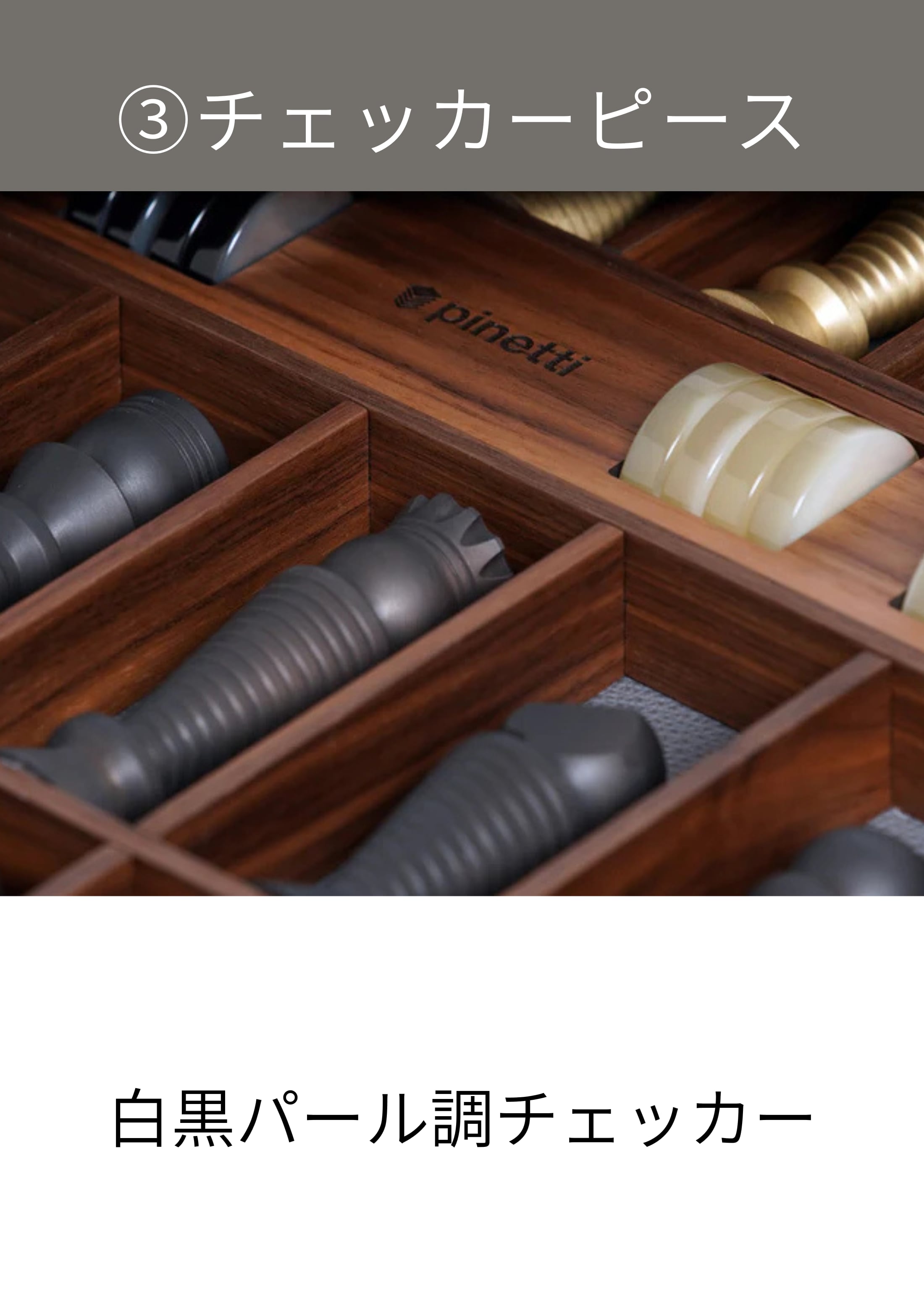 チェス駒は真鍮製、チェッカーピースはパール調樹脂。
